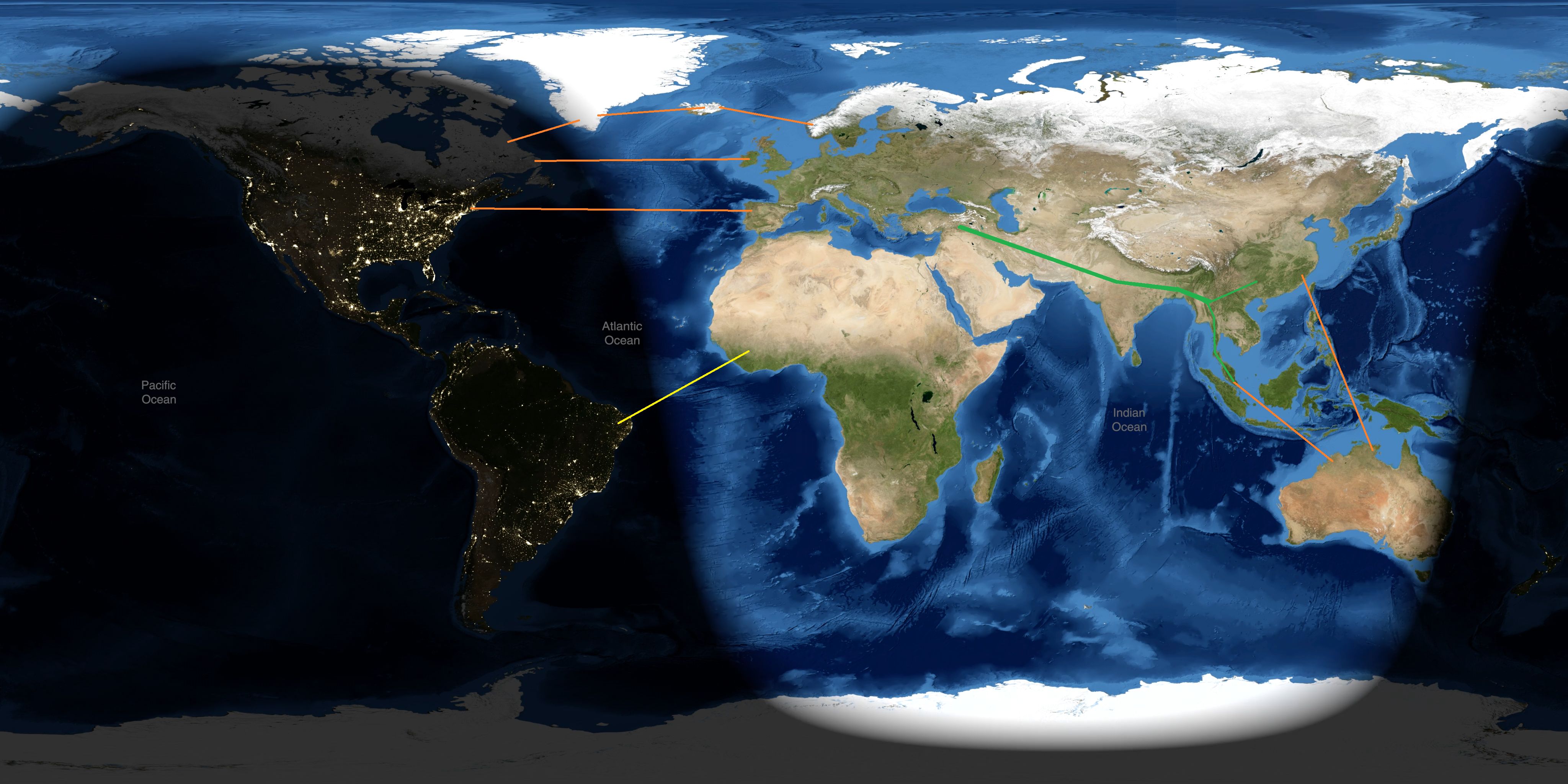 At any given moment, it is daylight somewhere on Earth and night elsewhere (video). Intercontinental HVDC links can move power from where it is being generated to where it is currently dark.